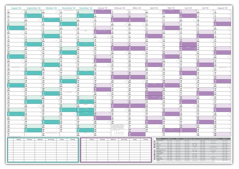 * Format ( 920 x 650 mm ) * 13 Monate (August Vorjahr bis August Folgejahr) * mit Zeitumstellungsmarkierung * Tageszählung * Schulferien für alle Bundesländer * nass abwischbar