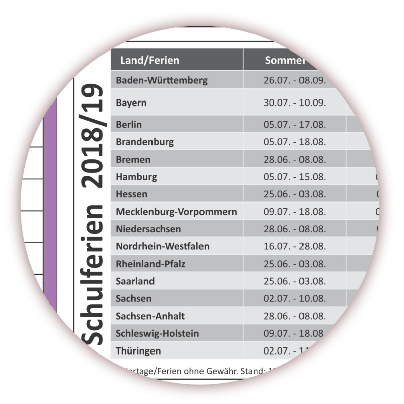 Hochwertige Schuljahreskalender 2018/2019. Gedruckt auf 170g/m² schwerem und vorderseitig mit Mattfolie beschichteten Bilderdruckpapier.