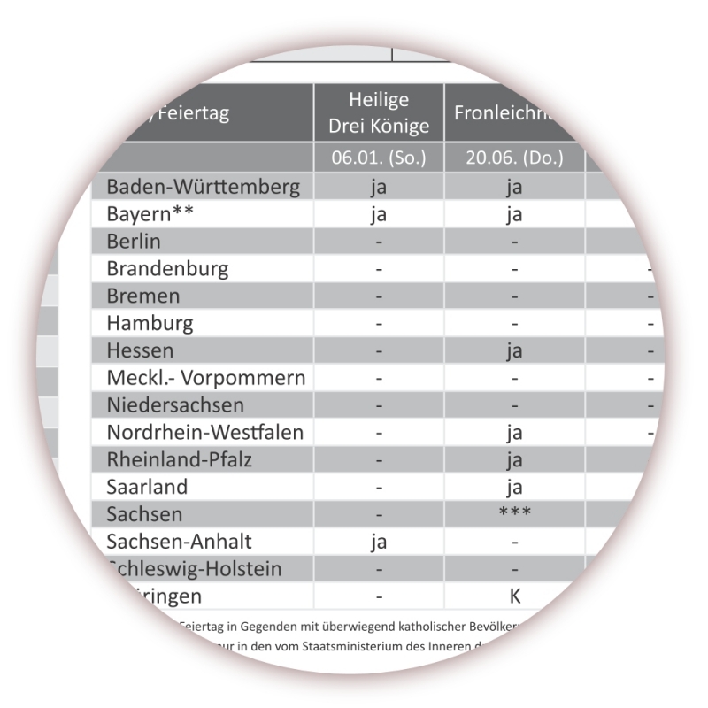 * Gesetzliche Feiertage für alle Bundesländer mit unterschiedlichen Regelungen