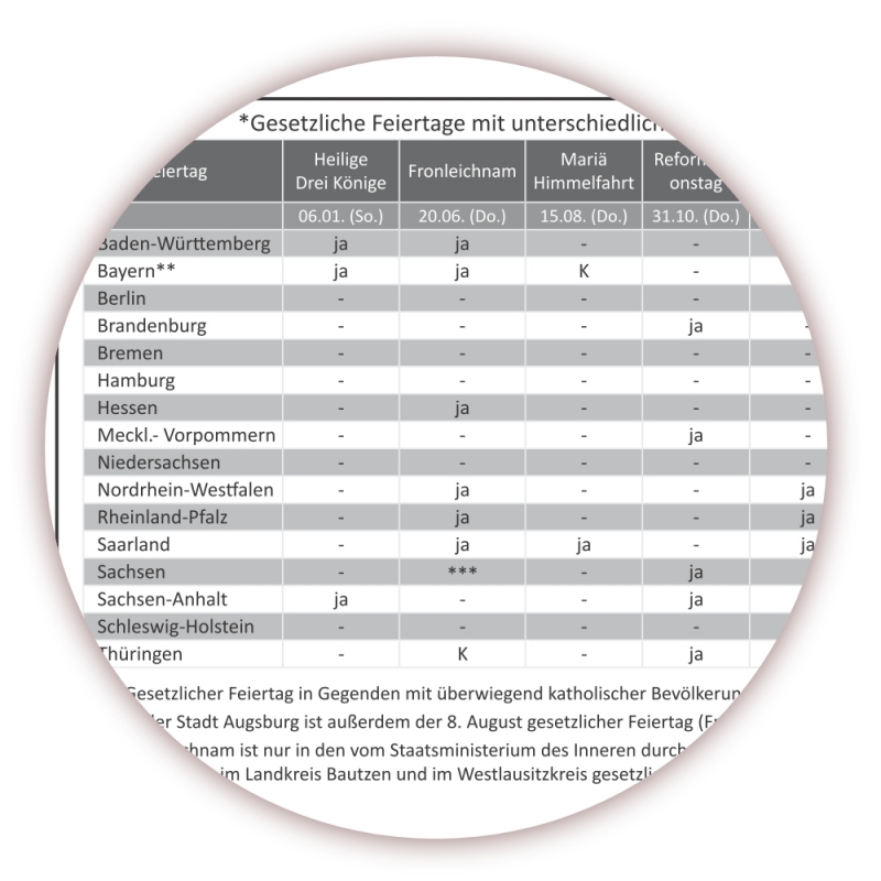 • Gesetzliche Feiertage mit unterschiedlichen Regelungen