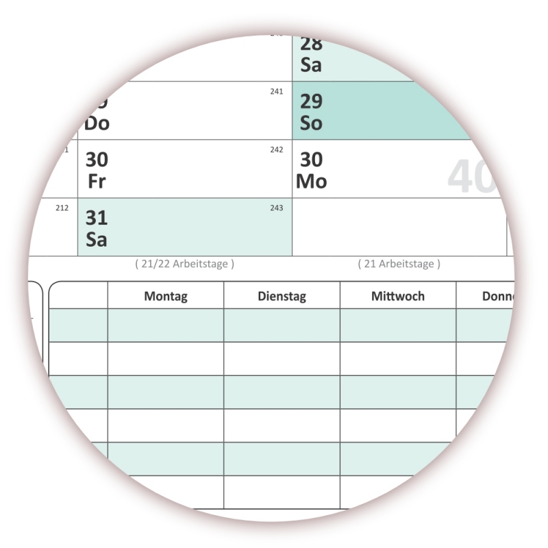 • Extra große Tageskästchen mit viel Platz für Eintragungen