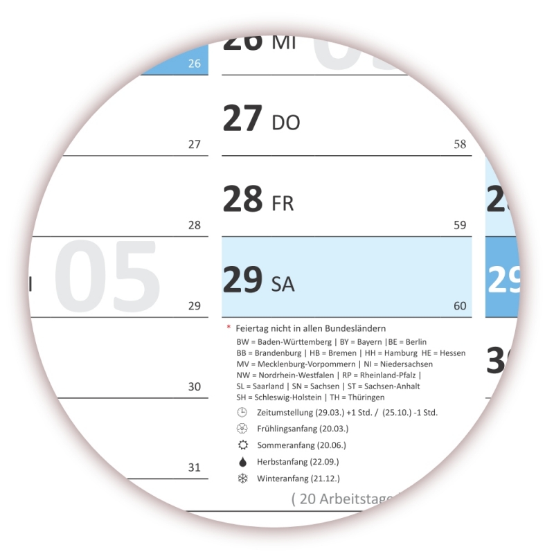 - Angabe der Kalenderwoche und des Jahrestages